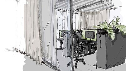 Im offenen Coworking-Umfeld gliedert RoomSpin den Raum in funktionale Arbeitsinseln.