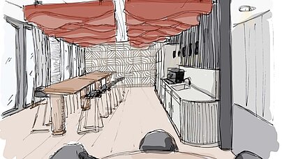 Der informelle Raum fördert Begegnungen und Austausch – bei Kaffee, Snacks oder einer kurzen Auszeit. Gleichzeitig kann hier auch leicht gearbeitet oder ein Gespräch geführt werden.