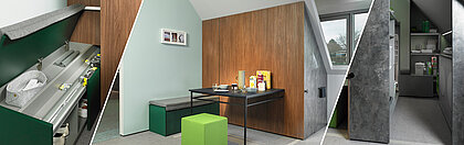 Living in just a small space becomes much more attractive when expectations are exceeded. This intelligent cabinet concept makes the sloped ceiling area a walk-in utility room. The furniture is a room within a room. The entire wall of furniture is simply pulled up when needed. Washing machine, tumble dryer, vacuum cleaner, cleaning products and much more can be kept behind it in any chosen way. All there, all inside your own four walls.
