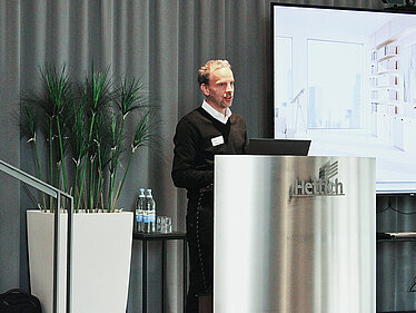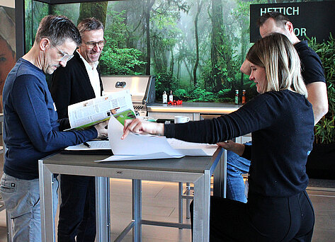 Nach diesem anregenden Einstieg ging es im Design-Workshop „RoomSpin für faszinierende Raumlösungen“ gleich hinein in die praktische Umsetzung. Unter der Moderation von Hettich-Innenarchitektin Luisa Bartnick entwickelten die „Innovations-Pioniere“ interaktiv eigene Ansätze für innovative Raumkonzepte auf Basis des Dreh-Schwenk-Systems RoomSpin. Hettich-Vertriebsleiter Sebastian Voss erläuterte im Anschluss, wie der Beschlaghersteller seine Partner bei der erfolgreichen Markteinführung und Umsetzung zukunftsweisender Lösungen mit dem RoomSpin professionell unterstützt. Durch das Workshop-Programm führten und begleiteten als Gastgeber Vertriebsleiter Jan Hübschmann und Olivia Wyrwalec aus dem Marketing, die den offenen Dialog aktiv förderten und Raum für Austausch und Co-Creation schufen.