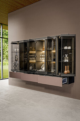 Dunkle Glasfronten und anspruchsvollste Stauraumlösungen verbinden Kochen mit Wohnkultur.