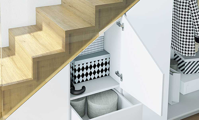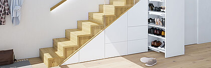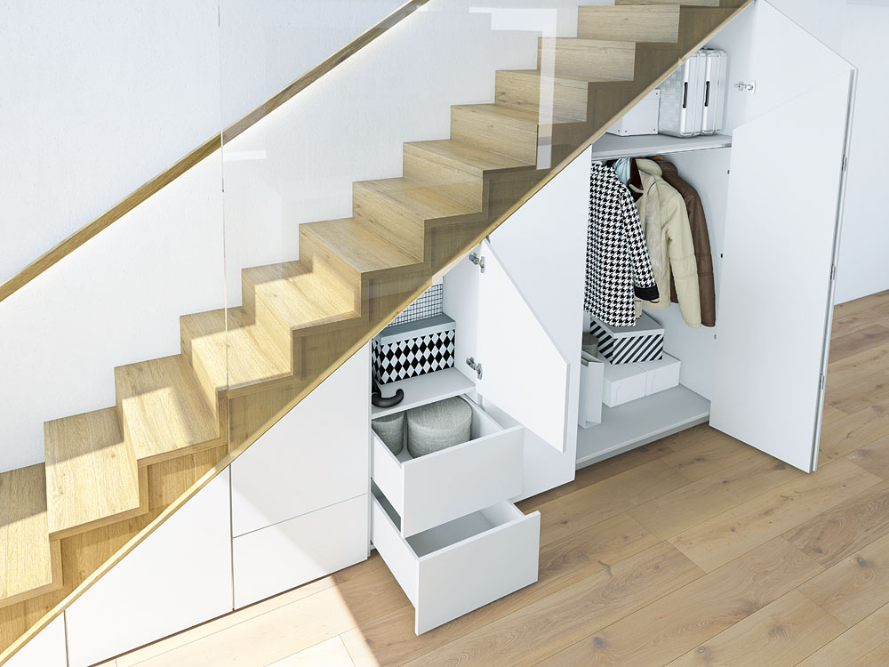 Effiziente Nutzung des „toten“ Raums unter der Treppe als Stauraum. Insbesondere in kleinen Wohnungen/Häusern schafft der Bereich unter der Treppe zusätzlichen Stauraum.