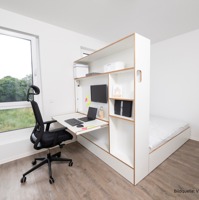 Gemeinsam mit dem Wohnungsbauunternehmen Vivawest entstand ein Konzept für bezahlbares, zukunftsorientiertes Wohnen. Im Mittelpunkt: Ein drehbares Bett, das das Schlafzimmer zum Multifunktionsraum macht. Die Lösung schafft mehr Platz für Mieter und denkt Wohnen, Arbeiten und Leben auf kleiner Fläche völlig neu.