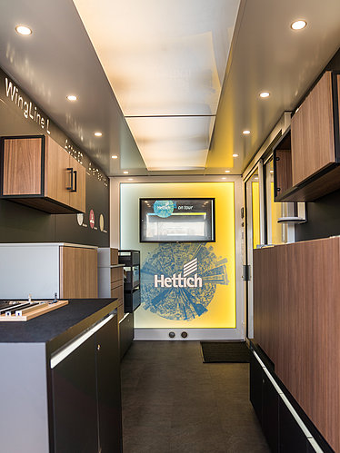 Nach einer kurzen Winterpause gehen die beiden Fahrzeuge jetzt mit der aktualisierten Produktschau auf große Fahrt. Im frisch renovierten Innenraum präsentiert Hettich unter anderem die brandneue Scharnierfamilie Novisys. Diese sehr wirtschaftliche Lösung wird den Markt für gedämpfte Scharniere befeuern. Denn mit Novisys zieht der integrierte Dämpfungskomfort auch ins mittlere Preissegment ein. Natürlich präsentiert Hettich auch sein bewährtes Premium-Drehtürscharnier Sensys im exklusiven, dunklen Farbton Obsidian und mit neuer „Push to open Silent“-Funktion. Mit den drei Systemen TopLine XL, SlideLine M und Wingline L zeigt Hettich seine besondere Kompetenz beim Schieben und Falten. Viel Emotion und Top-Design versprechen die Schubkastenplattform AvanTech YOU mit LED-Lichtsignatur „Illumination“ sowie das Cadro Alu-Rahmensystem, ebenfalls mit integrierter Lichttechnik. Die Auszeichnung von AvanTech YOU Illumination mit den renommierten Designpreisen Red Dot und iF unterstützt die Positionierung der Kunden bei designorientierten, exklusiven Küchen- oder Möbelprogrammen. Alle gezeigten Lösungen dürfen vor Ort direkt ausprobiert werden. Und wer noch mehr erfahren will, kann über den Touchscreen im „Hettich on tour“-Transporter weitere Informationen zu den Produkten, zur einfachen Konstruktion und Montage, zu nützlichen digitalen Services oder auch zum „Hettich eShop“ abrufen.