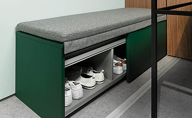 Living in just a small space becomes much more attractive when expectations are exceeded. This intelligent cabinet concept makes the sloped ceiling area a walk-in utility room. The furniture is a room within a room. The entire wall of furniture is simply pulled up when needed. Washing machine, tumble dryer, vacuum cleaner, cleaning products and much more can be kept behind it in any chosen way. All there, all inside your own four walls.