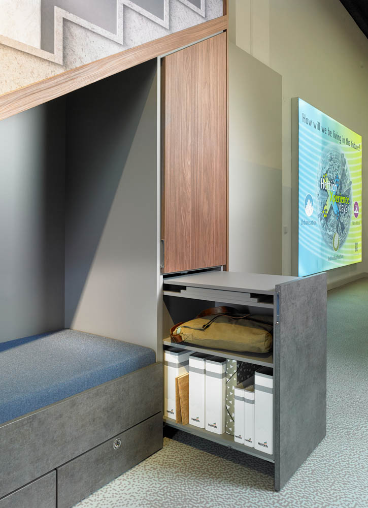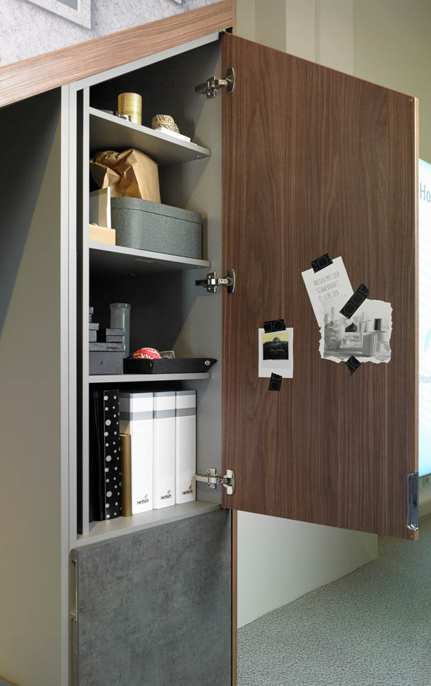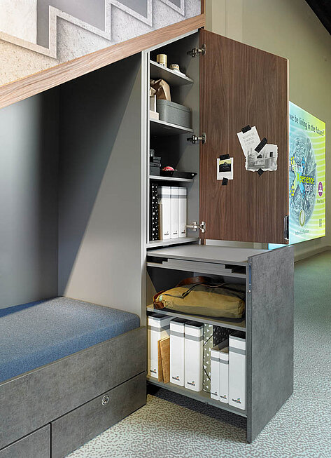A comfortable sitting and lounging surface with adjustable head section forms the central element. Well considered storage space all round provides space for keeping office materials and printer. The add on table creates a user friendly home working space without additional office chair. This is the look of on demand relaxation and working.