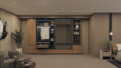 AvanTech YOU drawer systems with concealed 13 mm profiles provide handleless organisation at the wardrobe base, while Actro 5D runners ensure five-directional precision and stability.