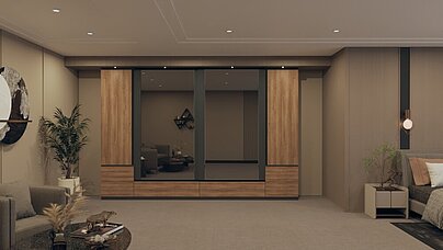 TopLine L's two-track, top-running sliding door system revolutionises the wardrobe experience with doors weighing up to 50 kg that glide with barely audible precision. The innovative Silent System ensures soft opening and closing from the moment you touch the door—no harsh slams, just elegant, controlled movement.