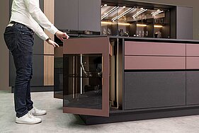 From ceiling-height furniture to small glass display elements – FurnSpin can bring rotation to everything. FurnSpin technology truly has the potential to change the world of furniture. The innovative FurnSpin fitting gets rid of old style formats and puts a creative new spin on furniture design. Open doors or flaps no longer get in the way – most of the cabinet body can now be moved with effortless ease. A stylish turn leaves furniture to reveal what's inside. Hiding everything from view again, a further spin returns furniture to its closed state. Remaining virtually hidden from view, the fitting comes with all the familiar user-friendly functions such as soft-closing or push-to-open, thus creating handleless furniture designs.