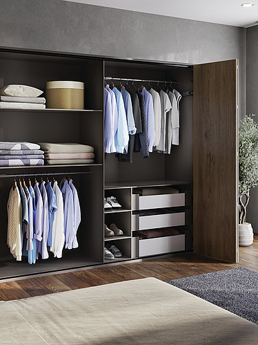 Hettich a optimisé son système de ferrures pour portes pliantes à tous les niveaux. Le résultat : encore plus de confort, un fonctionnement plus silencieux, une ouverture plus rapide, un montage plus simple – et au total, une liberté de conception supplémentaire pour un design de meuble de qualité avec WingLine L. La technique de ferrure presque invisible assure un aspect parfait, que ce soit dans l’armoire supérieure de la cuisine, dans la crédence ou dans la grande penderie. Des vantaux d’une hauteur maximale de 2600 mm, d’une largeur maximale de 600 mm et d’un poids maximal de 25 kg sont possibles. Le mécanisme d’ouverture « Push to move » permet d’ouvrir complètement l’ensemble de portes d’une simple pression. L’effet panoramique unique fascine et permet d’accéder à l’ensemble du contenu. Sans profilés gênants sur le fond du meuble, l’intérieur de l’armoire est encore plus accessible et utilisable en toute flexibilité. L’impact de la porte est minimal et la porte reste, en toute sécurité, en position ouverte : les tiroirs et les coulisses passent alors devant le panneau de porte sans collision. Un amortisseur d’ouverture ou de fermeture confortable pour la WingLine L permet également d’améliorer encore la convivialité de chaque meuble.