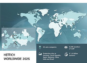 La part des ventes à l’international a représenté environ 79 % du chiffre d’affaires. À la fin de l'année 2025, le groupe Hettich employait environ 8200 collègues dans le monde, dont environ 3900 en Allemagne.